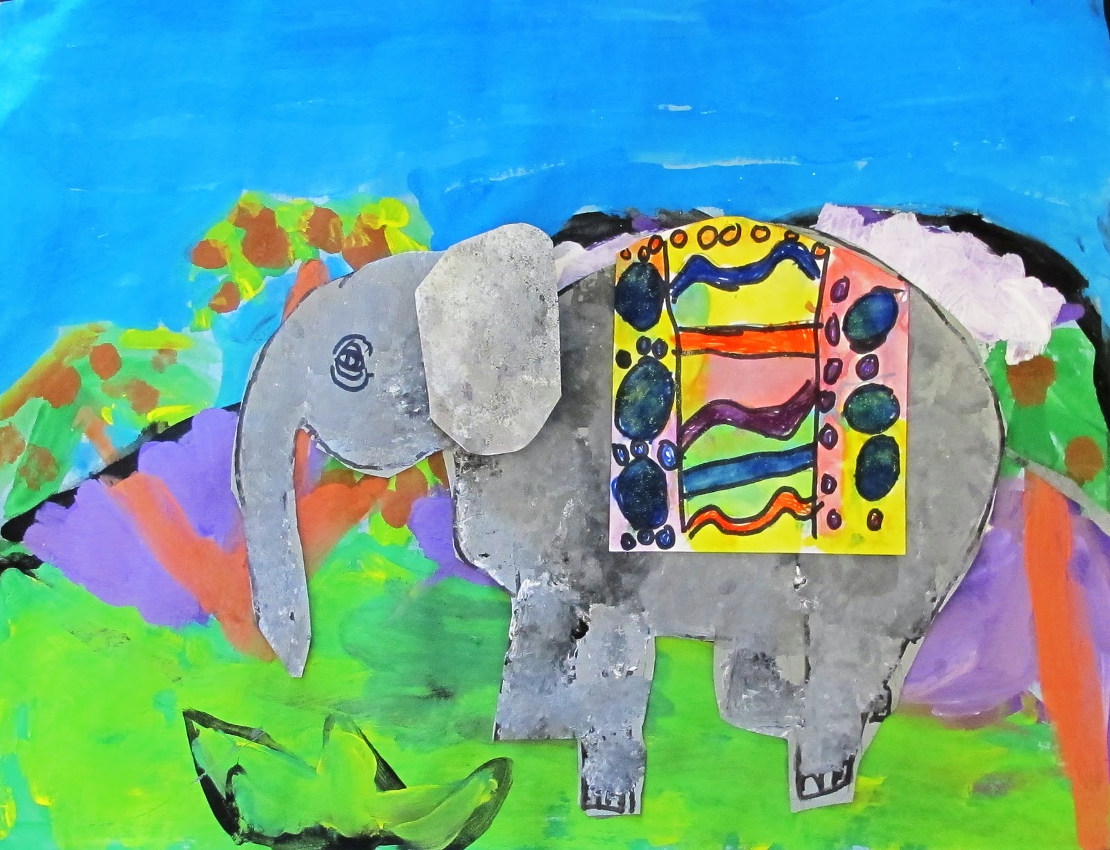 Second Graders looked at images of Indian Elephants from the International Folk Art Museum. We read the story Elephant Dance, a story about a boy and his grandfather from India. We looked at pictures of the various regions of India before painting the setting. Students learned to draw an elephant, sponge painted the skin and created a patterned blanket.