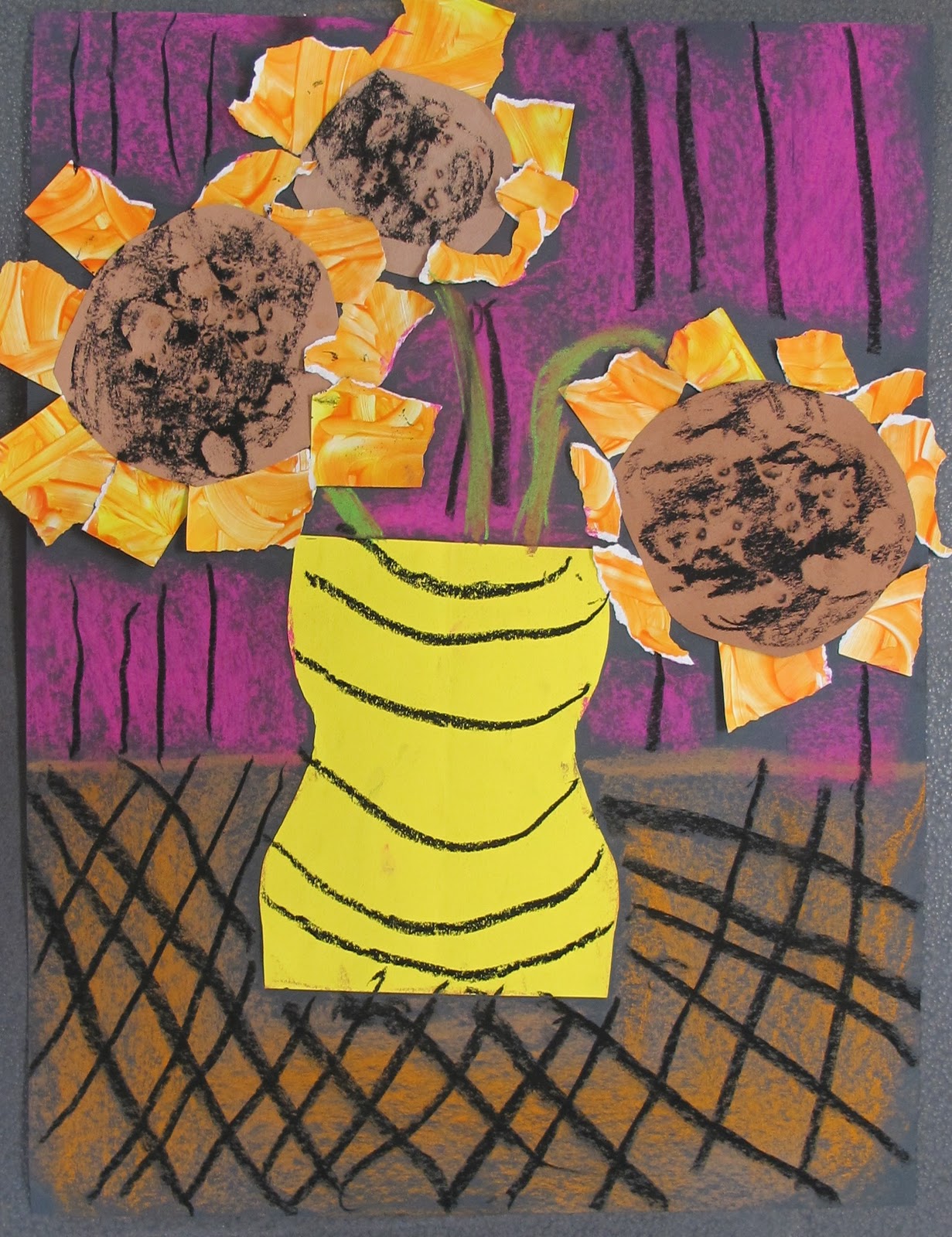 First Graders created their still life using finger paint paper for petals, symmetrical vases and chalk pastels.